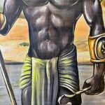​A Papyrus-style painting depicting the Egyptian God Anubis (jackal-headed) standing full-figure. Anubis holds an Ankh-scepter and stands by the Nile River or a lake, with palm trees and Pyramids visible in the desert background. Anubis has black skin (traditional symbolism for fertile soil/death) and wears golden jewelry and armor. The artwork blends traditional aesthetics with dark and warm colors.