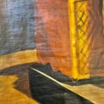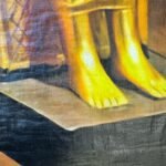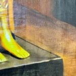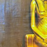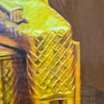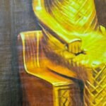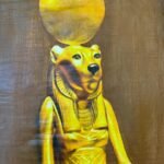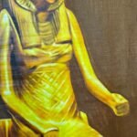 ​A painting in a papyrus-like style depicting a statue of the Egyptian Goddess Sekhmet (lioness-headed with a solar disc) seated firmly on a throne. The statue is rendered in vibrant gold against a dark maroon background, giving it a majestic, classical appearance.